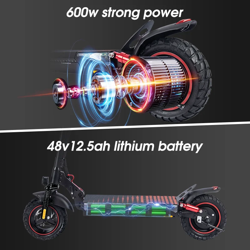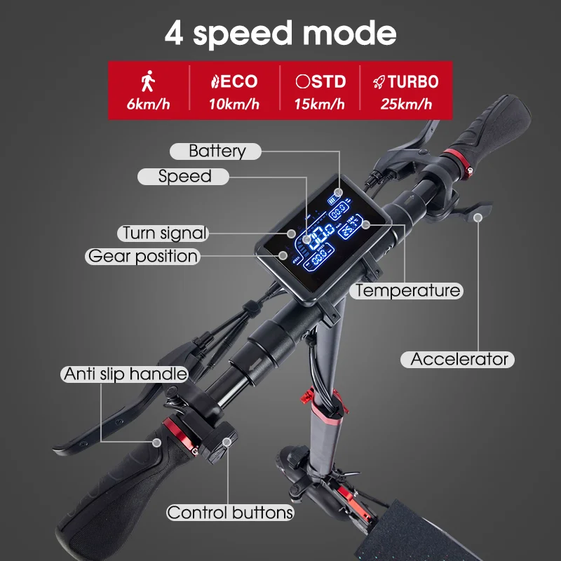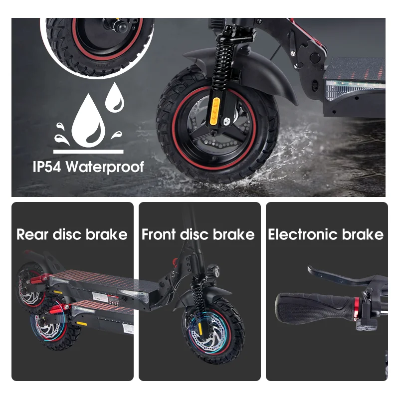 The 10-inch off-road tires are designed to tackle various terrains, from city streets to dirt paths. Paired with shock absorbers, guarantees an excellent riding experience, especially for suburban commuting.