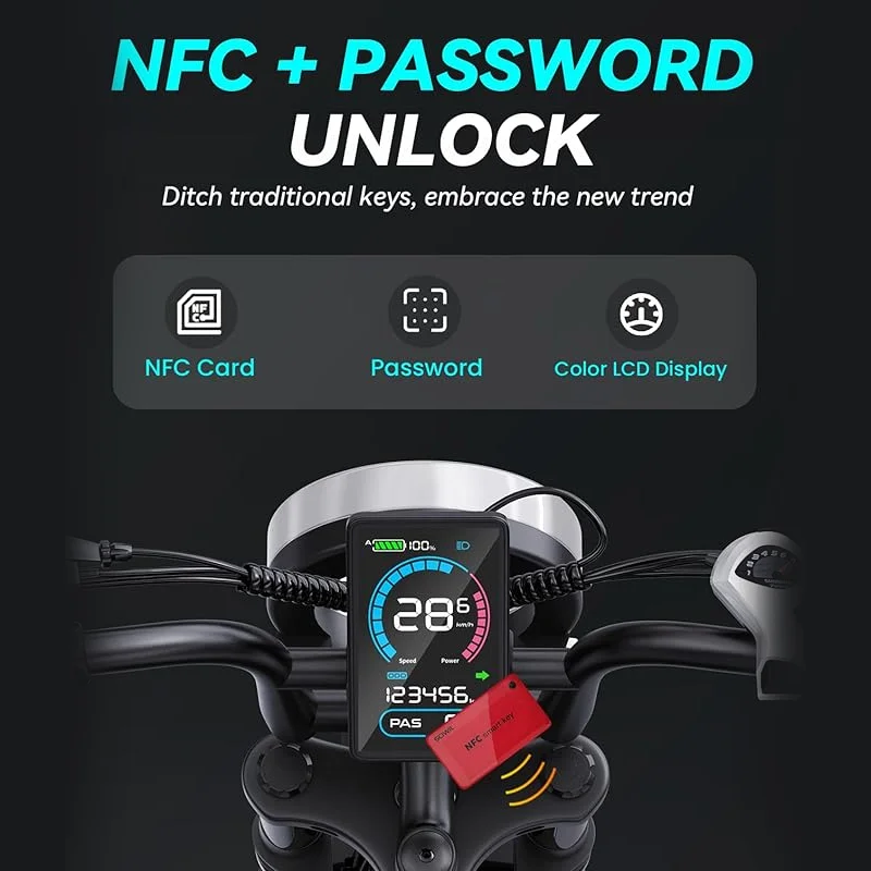 💎NFC/Password Unlock & Color LCD Display】Forget bulky keys! Unlock the e-bike in 1 second via NFC card or 4-digit password—ideal for busy mornings or when you lend the ebike to family. The bright color LCD display shows speed, battery level, riding mode, mileage, and time at a glance—even visible in sunlight. No more guessing battery life; stay informed to plan your ride.