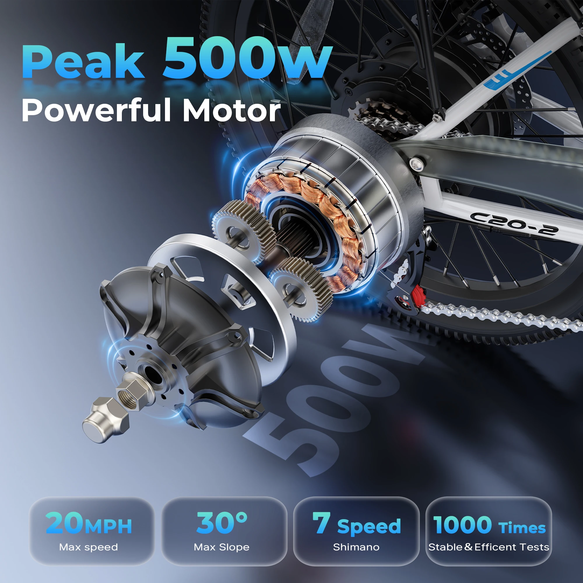 C20-2 folding ebike is equipped with a high-performance brushless motor—delivering up to 500W of peak power and speeds of 20MPH. Paired with a 36V 7.8Ah removable lithium battery, it provides up to 40 miles of riding range on pedal assist mode and recharges in just 4–5 hours, keeping your commute or weekend rides worry-free